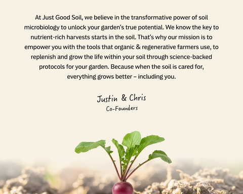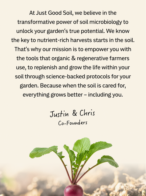 At Just Good Soil, we believe that the key to optimal garden health and nutrient-rich harvests starts from the roots up. Our mission is to empower home gardeners by revolutionizing soil health through science.
